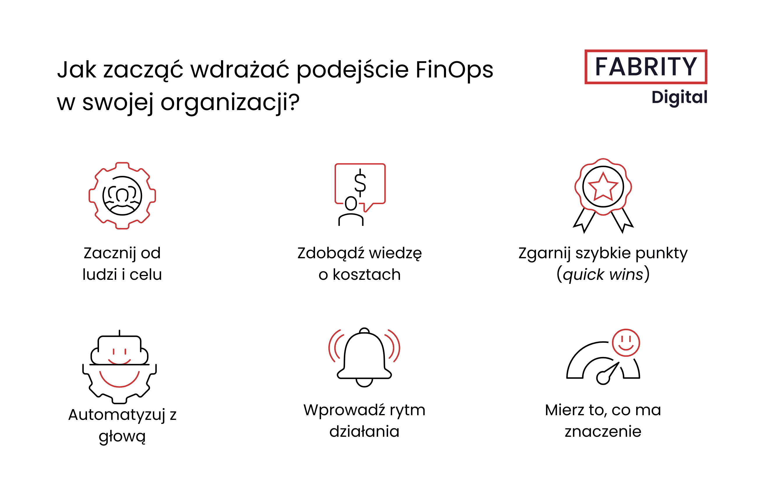 - Wdrażanie FinOps to proces małych kroków — należy zacząć od małego zespołu i jasnych celów, zdobyć wiedzę o kosztach, szukać szybkich efektów (quick wins), działać rytmicznie, automatyzować i mierzyć wartość, nie tylko wydatki.