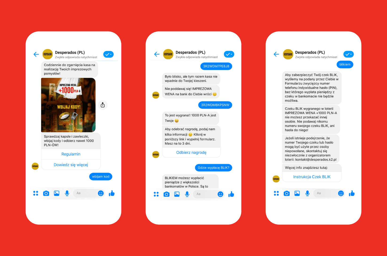 - Uczestnik wpisywał kod w rozmowie z chatbotem w Messengerze.