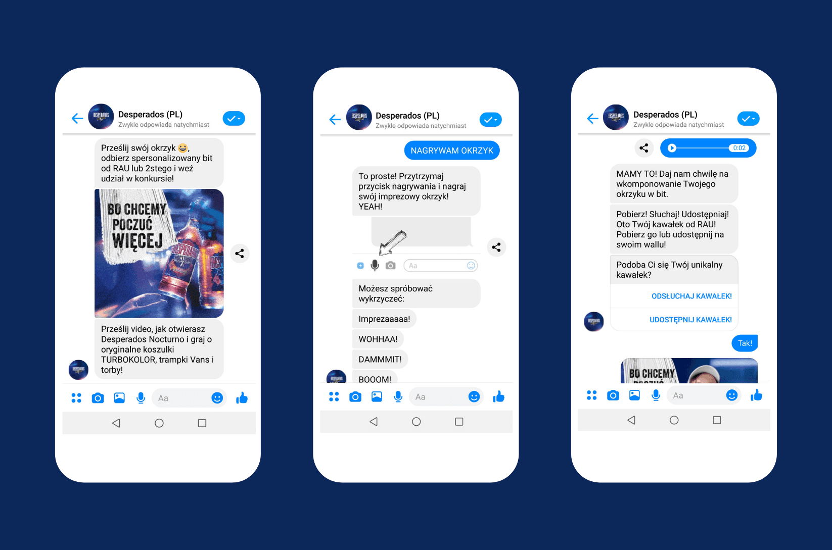 Po realizacji kilku innych kampanii dla marki zostaliśmy zaproszeni do stworzenia nowej akcji promcyjnej, tym razem dla Desperados Nocturno. Klient oczekiwał świeżego konceptu, który nadal wykorzystywałby potencjał Messengera jako głównego kanału interakcji. Stworzyliśmy bota-kompozytora, który zamieniał nagrania głosowe użytkowników w spersonalizowane utwory muzyczne. Uczestnicy nagrywali w Messengerze krótkie komunikaty dźwiękowe, wyrażając swoje emocje. Bot automatycznie: