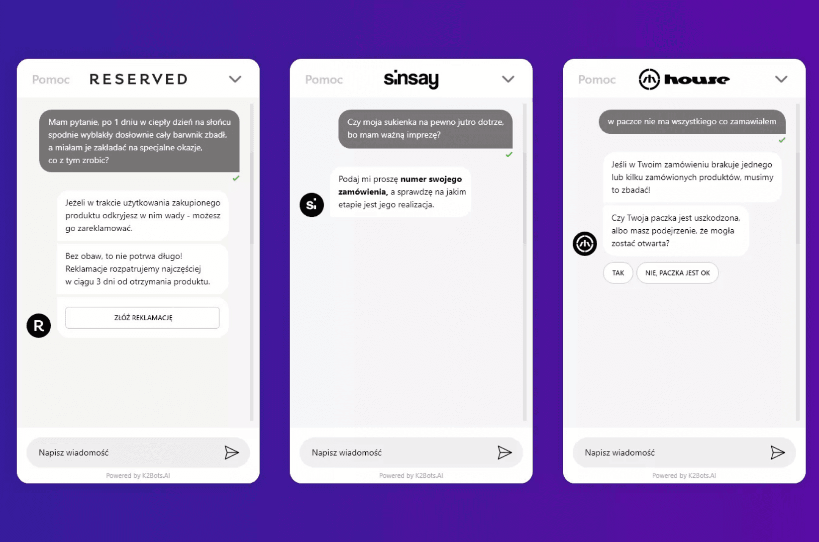 Dla marek należących do LPP wdrożyliśmy chatbota drugiej generacji dostępnego na stronach pomocy Reserved, Cropp, House, Mohito i Sinsay. Rozwiązanie zostało zaprojektowane tak, aby prowadzić rozmowę w naturalnym języku, odpowiadając na pytania otwarte bez konieczności korzystania z formularzy i list wyboru. Chatbot obsługuje obecnie 200 najczęściej występujących problemów zgłaszanych do Contact Center przez klientów e-commerce. Pomaga m.in. w sprawach dotyczących zamówień, zwrotów, reklamacji oraz dostaw, rozpoznając aż 30 różnych statusów przesyłek. W przypadku bardziej złożonych zgłoszeń lub sytuacji wymagających udziału człowieka chatbot automatycznie przełącza rozmowę do konsultanta BOK. Skuteczność rozwiązania jest regularnie oceniana i rozwijana na podstawie analizy rozmów wykonywanej przez człowieka, co pozwala stale dotrenowywać bota i zwiększać jego efektywność. Chatbot został wdrożony razem z chmurowym contact center Genesys PureCloud, które obsługuje rozmowy eskalowane do konsultantów oraz komunikację z profili marek LPP na Facebooku. Warstwę rozumienia języka naturalnego zapewnia Google Dialogflow, rozszerzony o autorską technologię.